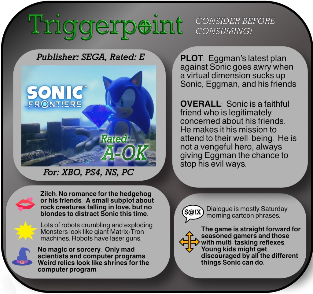 reviews, Video Game Collection Triggerpoint: Sonic Frontiers Date: January 12, 2025Author: doctormidnight83 A new segment that looks at the content of popular games, movies, TV Like Loading... Related