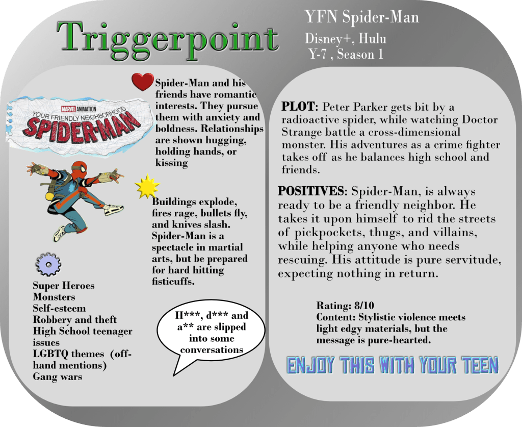 Your Friendly Neighborhood Spider-Man is an animated series that aired in 2025. It presents a more grounded and emotional version of Spider-Man, focusing on Peter Parker’s journey as both a superhero and a young man trying to balance his personal life. The show explores his struggles with relationships, his responsibilities as Spider-Man, and the emotional toll of his heroic duties. (Synopsis by Chat-GPT).